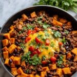 This Amazing 30-Minute Sweet Potato Skillet Dinner is a hearty, flavorful one-pan meal featuring ground beef, tender sweet potatoes, black beans, and vibrant spices. Perfect for a quick weeknight dinner, it combines simple ingredients with a savory chili-seasoned tomato base, garnished with melted cheddar and fresh cilantro for an irresistible finish.