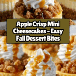 These Apple Crisp Mini Cheesecakes combine the creamy richness of cheesecake with the warm, spiced flavors of apple crisp. Perfect for fall, these individual desserts feature a graham cracker crust, a smooth cream cheese filling, a tender cinnamon-spiced apple layer, and a buttery oat streusel topping. Finished with a drizzle of caramel sauce, they offer a delightful balance of textures and flavors in a convenient cupcake-sized treat.