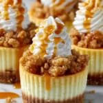 These Apple Crisp Mini Cheesecakes combine the creamy richness of cheesecake with the warm, spiced flavors of apple crisp. Perfect for fall, these individual desserts feature a graham cracker crust, a smooth cream cheese filling, a tender cinnamon-spiced apple layer, and a buttery oat streusel topping. Finished with a drizzle of caramel sauce, they offer a delightful balance of textures and flavors in a convenient cupcake-sized treat.