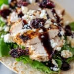 - Step 4: Lay out the tortillas and evenly divide the arugula, sliced chicken, dried cranberries, goat cheese, pecans, and balsamic glaze among them.