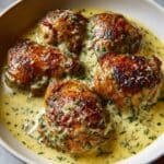 This Bobby Flay-inspired chicken thighs recipe delivers tender, juicy bone-in, skin-on chicken simmered in a rich and creamy garlic sauce. With a golden sear followed by slow simmering in a luscious blend of heavy cream, garlic, Dijon mustard, and fresh lemon juice, this dish is easy to prepare yet packed with flavor. Perfect for a comforting dinner, it balances the crispy skin with a velvety sauce that is topped with fresh parsley for brightness.