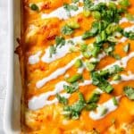 - Garnish and Serve: Remove the enchiladas from the oven and sprinkle with blue cheese crumbles. Drizzle ranch dressing over the top, then garnish with chopped fresh cilantro and green onions. Serve with additional Buffalo hot sauce if desired for extra heat.