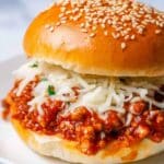 Chicken Parmesan Sloppy Joes combine the classic flavors of chicken Parmesan in a fun, easy-to-make sloppy joe sandwich, featuring ground chicken simmered in marinara sauce and pesto, topped with melted mozzarella and Parmesan cheese, served on toasted brioche buns.