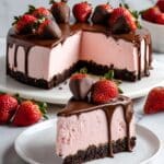 This decadent Chocolate Covered Strawberry Cheesecake combines a creamy, smooth cheesecake filling atop a crunchy graham cracker crust, topped with luscious chocolate ganache and fresh, glossy strawberries. Perfect for celebrations or an indulgent treat, this dessert pairs the classic flavors of cheesecake with rich chocolate and fresh fruit for an irresistible finish.