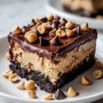 - Step 6: Sprinkle the top with mini chocolate chips and chopped peanut butter cups for extra flavor and crunch. Slice into squares and serve chilled.