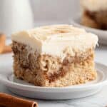 Store the cinnamon roll poke cake covered in the refrigerator for up to 4 days. Let it come to room temperature or warm slightly before serving for the best flavor and texture. Any leftover frosting can be kept in an airtight container in the fridge for up to 1 week.