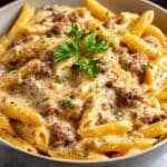 Keywords: creamy beef pasta, penne pasta recipe, easy dinner, Italian seasoning, Parmesan beef pasta, comfort food