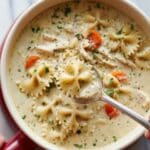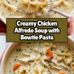 A rich and comforting Creamy Chicken Alfredo Soup made with tender chicken, bowtie pasta, and a luscious blend of mozzarella and Parmesan cheeses simmered in a creamy herb-infused broth. Perfect for a cozy meal that combines all the flavors of classic Alfredo pasta into a hearty soup.