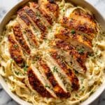 - Serve: Plate the pasta and top it with the sliced chicken strips. Garnish with freshly chopped parsley and lemon wedges for an added burst of freshness. Serve immediately while warm.
