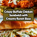 This Crispy Buffalo Chicken Sandwich with Ranch Slaw features juicy, buttermilk-marinated fried chicken coated in a crunchy seasoned crust, tossed in spicy buffalo sauce, and topped with a creamy, tangy ranch slaw made from fresh cabbage and carrots. Served on toasted brioche buns, this sandwich combines bold flavors and textures for a delicious handheld meal perfect for lunch or dinner.