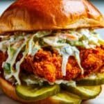 This Crispy Buffalo Chicken Sandwich with Ranch Slaw features juicy, buttermilk-marinated fried chicken coated in a crunchy seasoned crust, tossed in spicy buffalo sauce, and topped with a creamy, tangy ranch slaw made from fresh cabbage and carrots. Served on toasted brioche buns, this sandwich combines bold flavors and textures for a delicious handheld meal perfect for lunch or dinner.