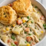 - Serve: Spoon the creamy chicken pot pie filling into bowls and top each serving with a warm buttermilk biscuit for a classic, comforting meal.