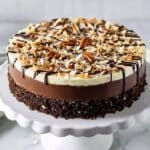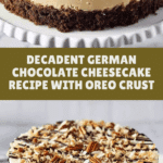 Indulge in the rich, creamy decadence of German Chocolate Cheesecake, featuring a chocolatey Oreo crumb crust, a luscious cream cheese and German chocolate filling, and a gooey coconut-pecan topping. This dessert combines classic cheesecake smoothness with the iconic flavors of German chocolate cake for an unforgettable treat.