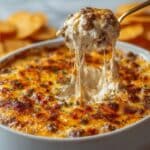 Keywords: cheesy dip, baked dip, sausage dip, party appetizer, game day recipe, creamy dip, spicy dip