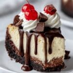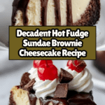 Indulge in the rich and decadent Hot Fudge Sundae Brownie Cheesecake, a perfect blend of fudgy brownies, creamy cheesecake, and luscious homemade hot fudge topping. This dessert combines a brownie base with a smooth cheesecake layer, finished with a silky chocolate fudge sauce, whipped cream, chocolate chunks, and maraschino cherries for an irresistible treat perfect for any occasion.