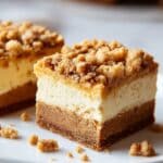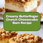 These Butterfinger Crunch Cheesecake Bars combine a creamy, tangy cheesecake filling with a buttery graham cracker crust and the irresistible crunch of chopped Butterfinger candy. Topped with a drizzle of melted chocolate and optional peanuts, they make for an indulgent treat perfect for any occasion.