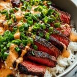 Store any leftover components separately in airtight containers in the refrigerator for up to 3 days. Reheat the rice and steak gently in a skillet or microwave before assembling the bowls again. Keep the spicy cream sauce chilled and stir well before using if separated.