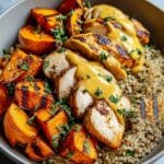 This Maple Dijon Chicken & Sweet Potato Bowl is a wholesome and comforting meal perfect for busy weeknights. It combines tender, flavorful chicken with caramelized sweet potatoes and a hearty grain base, all enhanced by a sweet and tangy maple Dijon sauce.