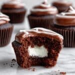 Keywords: marshmallow stuffed cupcakes, devil’s food cupcakes, chocolate cupcakes, stuffed cupcakes, marshmallow center, chocolate frosting dessert