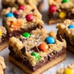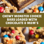Delightfully chewy and packed with chocolate chips, M&M’s, and oats, these Monster Cookie Bars bring together the perfect combination of peanut butter richness and classic cookie flavors. Baked in a 9×9 pan for easy slicing, they make a great treat for sharing or an indulgent snack.