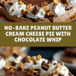 This No-Bake Cream Cheese Peanut Butter Pie with Chocolate Whipped Cream combines a buttery graham cracker crust with a smooth, creamy peanut butter and cream cheese filling. Topped with rich chocolate whipped cream, it’s an indulgent and easy-to-make dessert perfect for any occasion without heating up your kitchen.