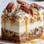 No-Bake Pecan Pie Lasagna is a creamy, layered dessert that combines crunchy graham cracker crust, smooth cream cheese filling, and a luscious pecan pie pudding layer. This easy-to-make dessert requires no baking and is perfect for holiday gatherings or any occasion that calls for an indulgent treat with layers of texture and flavor.