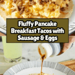 Enjoy a delicious and hearty breakfast with these Pancake Breakfast Tacos, featuring fluffy pancakes used as soft tortilla shells filled with savory sausage, crispy hash brown potatoes, cheesy scrambled eggs, and a touch of sweet maple syrup for the perfect balance of flavors.
