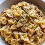 This Parmesan Garlic Beef Bowtie Pasta is a comforting and flavorful meal that comes together quickly for busy weeknights. Tender bowtie pasta is coated in a creamy, cheesy sauce with savory ground beef and a hint of garlic. It’s a satisfying dish that the whole family will enjoy.