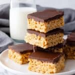 Keywords: Peanut Butter Rice Krispie Treats, Peanut Butter Marshmallow Bars, Chocolate Topped Rice Krispies, No Bake Dessert, Easy Party Treat