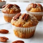 - Fill Muffin Cups: Spoon the batter into the prepared muffin cups, filling each about three-quarters full. Sprinkle the pecan topping evenly over each muffin, then press a whole pecan half on top for decoration and added crunch.