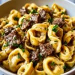 This Philly Cheesesteak Tortellini Pasta combines classic flavors of a Philly cheesesteak with tender cheese tortellini in a creamy, flavorful sauce. Ground beef or shaved steak is sautéed with bell peppers, onions, and garlic, then simmered in a rich mushroom cream sauce and mixed with cheesy tortellini for a comforting, hearty meal perfect for weeknight dinners.