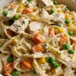 Keywords: chicken pot pie pasta, creamy chicken pasta, quick chicken dinner, one skillet chicken pasta, comfort food, easy family meal