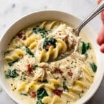This Quick White Lasagna Soup is a comforting and creamy dish inspired by traditional lasagna flavors in an easy-to-make soup form. Tender chunks of chicken, sun-dried tomatoes, tender pasta, spinach, and a luscious creamy broth come together quickly, topped with a blend of ricotta, Parmesan, and mozzarella cheeses for a rich finish.