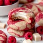 These Raspberry White Chocolate Cheesecake Cookies are a delightful combination of creamy white chocolate cheesecake filling, sweet and tangy raspberry jam, and soft, buttery cookies. Each cookie features pockets of luscious homemade raspberry jam swirled throughout the dough and is stuffed with a frozen white chocolate cheesecake center, creating a decadent dessert perfect for any occasion.