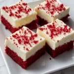 - Frost and Serve: Spread the frosting evenly over the cooled bars. Optionally, sprinkle red velvet crumbs on top for decoration. Cut into bars and serve.