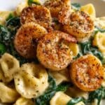 Shrimp Tortellini with Garlic Sauce is a rich and flavorful dish featuring succulent seared shrimp tossed with cheese-filled tortellini in a creamy garlic sauce with hints of white wine and Parmesan cheese. This easy skillet recipe combines fresh baby spinach for a touch of green and a spicy kick from crushed red pepper, making it a comforting and elegant meal perfect for any occasion.