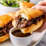 Store leftover shredded beef and broth in an airtight container in the refrigerator for up to 4 days. Keep rolls separate to prevent them from getting soggy. Reheat the beef gently on the stove or in the microwave, and warm the rolls in the oven before assembling. The broth can be reheated and used for dipping as needed.