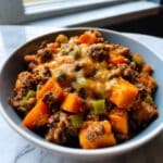 This Southwest Ground Beef and Sweet Potato Skillet is a vibrant, hearty one-pan meal featuring tender sweet potatoes, seasoned ground beef, black beans, and diced tomatoes with green chilies. It combines bold southwestern spices like chili powder, cumin, and oregano for a comforting, flavorful dish perfect for a quick dinner. Topped with melted cheddar cheese and fresh cilantro, it’s both satisfying and nutritious.