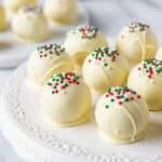 Delight in these festive Sugar Cookie Truffles, a creamy and colorful holiday treat made from heated cake mix, butter, and sprinkles, all dipped in luscious white chocolate. Perfect for Christmas gatherings or as a sweet seasonal gift.