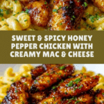 Keywords: honey pepper chicken, glazed chicken, creamy mac and cheese, comfort food, easy dinner recipe, chicken thighs recipe, cheesy macaroni