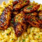 - Serve: Spoon the creamy mac & cheese into serving bowls or plates. Top with the sweet and spicy glazed chicken pieces. Garnish with fresh parsley if desired for a pop of color and freshness.