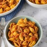 - Medium shell pasta or similarly shaped pasta like elbow macaroni works well to hold the sauce.