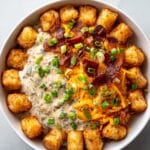 A savory and comforting Tater Tot Breakfast Bowl featuring crispy oven-baked tater tots, fluffy scrambled eggs, rich sausage gravy, and melted shredded cheddar cheese. This hearty breakfast bowl is topped with optional fresh herbs and bacon bits, perfect for a satisfying morning meal with customizable variations to suit different tastes and dietary needs.