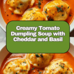 Keywords: Tomato dumpling soup, cheesy dumplings, creamy tomato soup, basil soup, comfort food, autumn soup, homemade soup