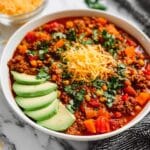 - Serve: Divide the chili into bowls and garnish with chopped cilantro, shredded cheddar cheese, and sliced avocado as desired. Enjoy your warm, nourishing meal!
