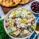 - Step 3: Stir in the chopped cooked chicken, chopped romaine lettuce, halved grape tomatoes, sliced pepperoncini peppers, Kalamata olives, chopped red onion, and crumbled feta cheese until everything is evenly coated with the tzatziki dressing.