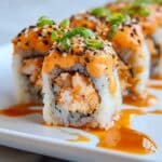 Keywords: Volcano Roll, sushi recipe, tempura shrimp sushi, spicy sushi roll, sushi with avocado, broiled sushi, Japanese-American sushi