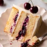 - Repeat Layering: Add the second cake layer, frost it with 3/4 cup frosting, pipe the border, and spread the remaining cherry filling. Place the third cake layer on top, upside down for a flat surface.